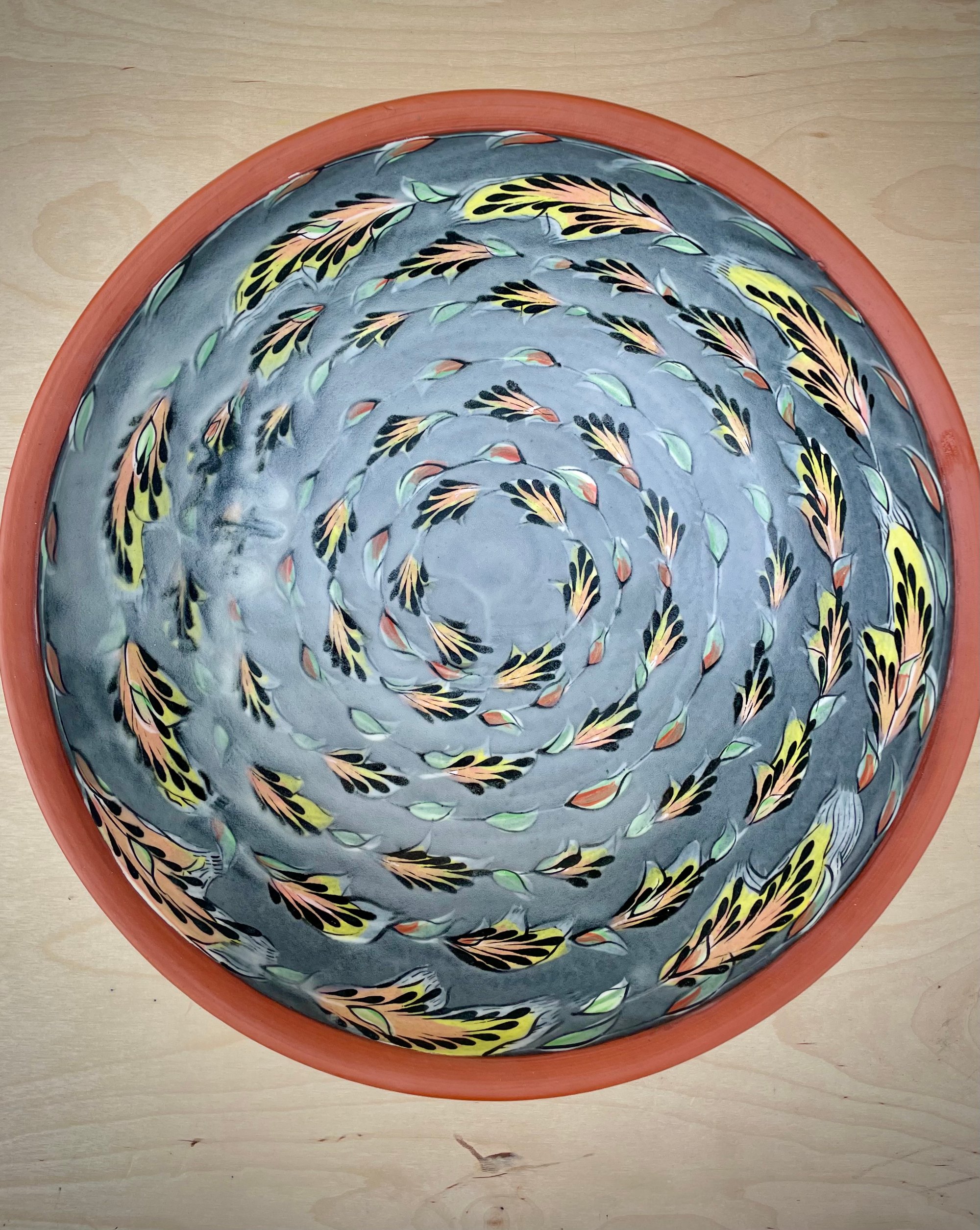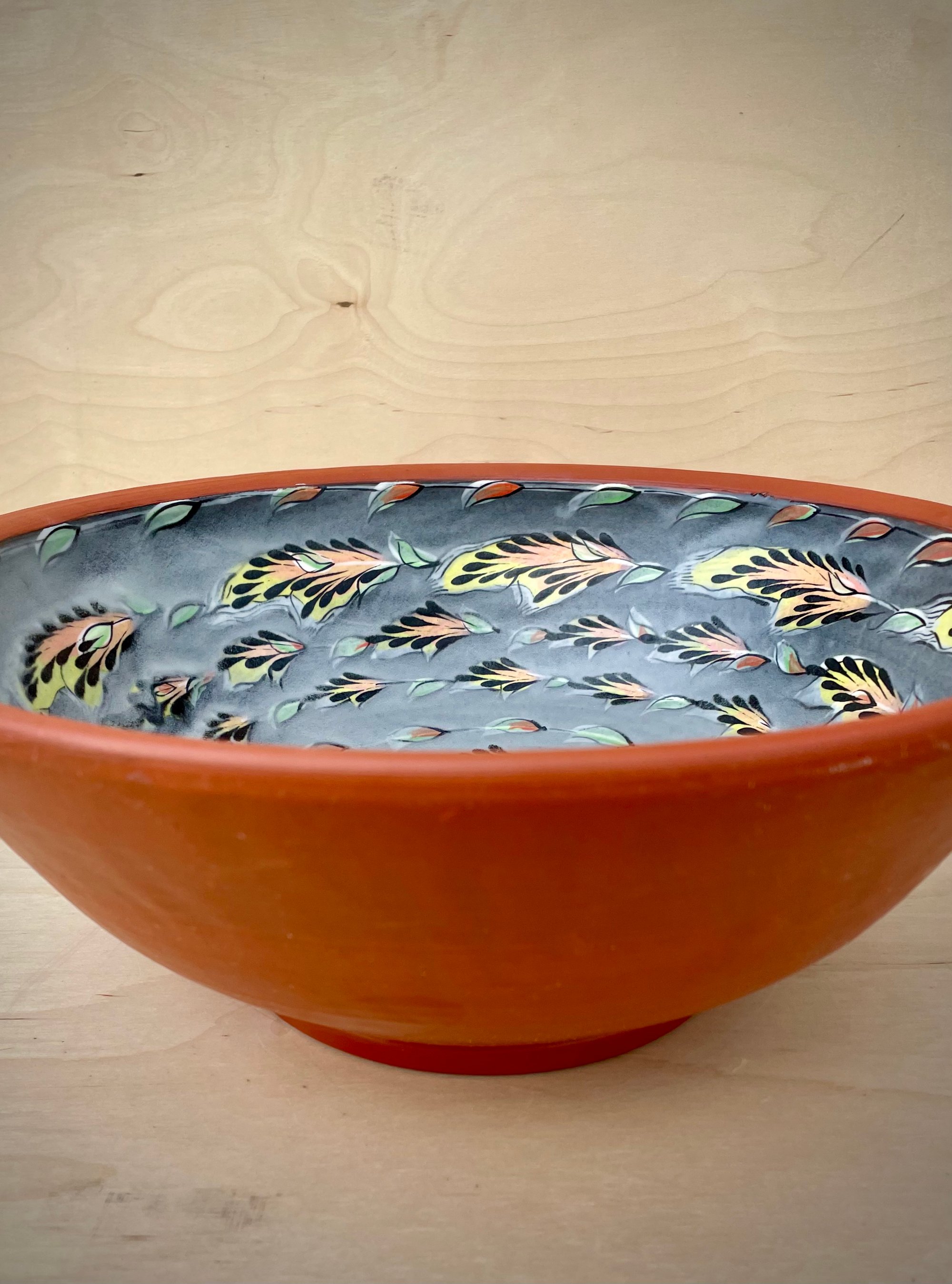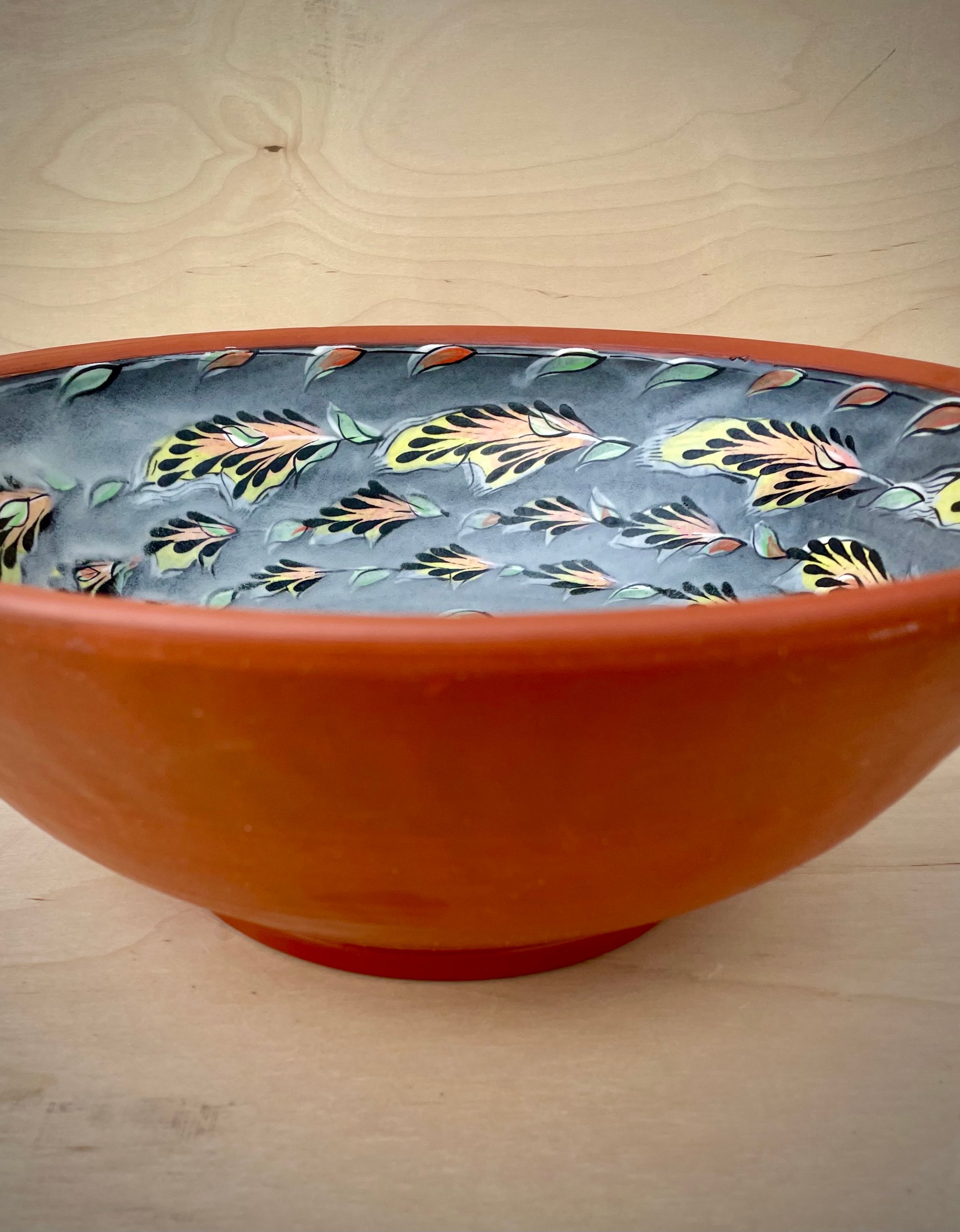 It's big. The outside is brick colored. It's a bowl. This is an oversized serving bowl/centerpiece. It is decorated with underglazes on the inside and glazed to be food, microwave, and dishwasher safe. The outside is terra sig and smooth.