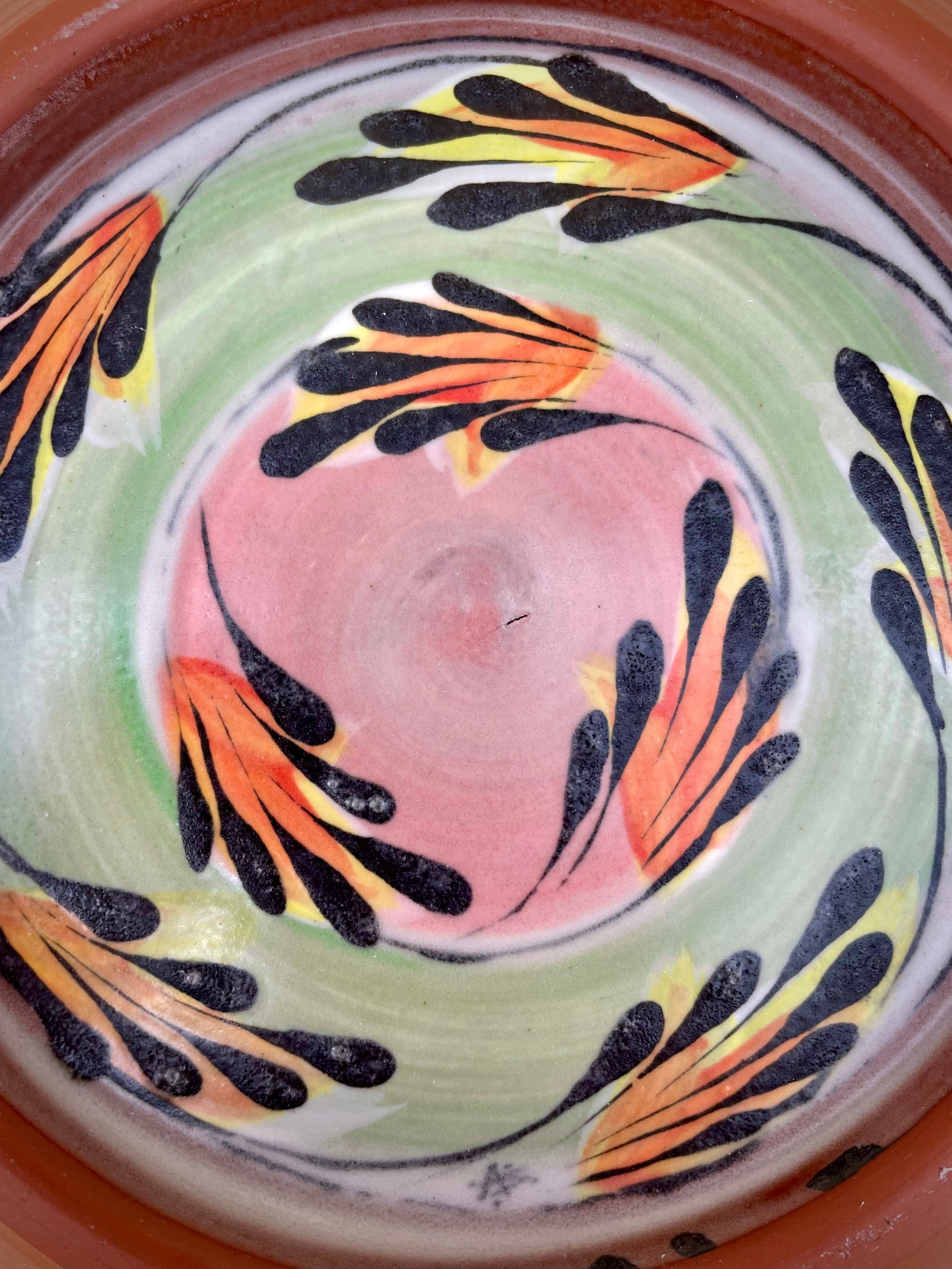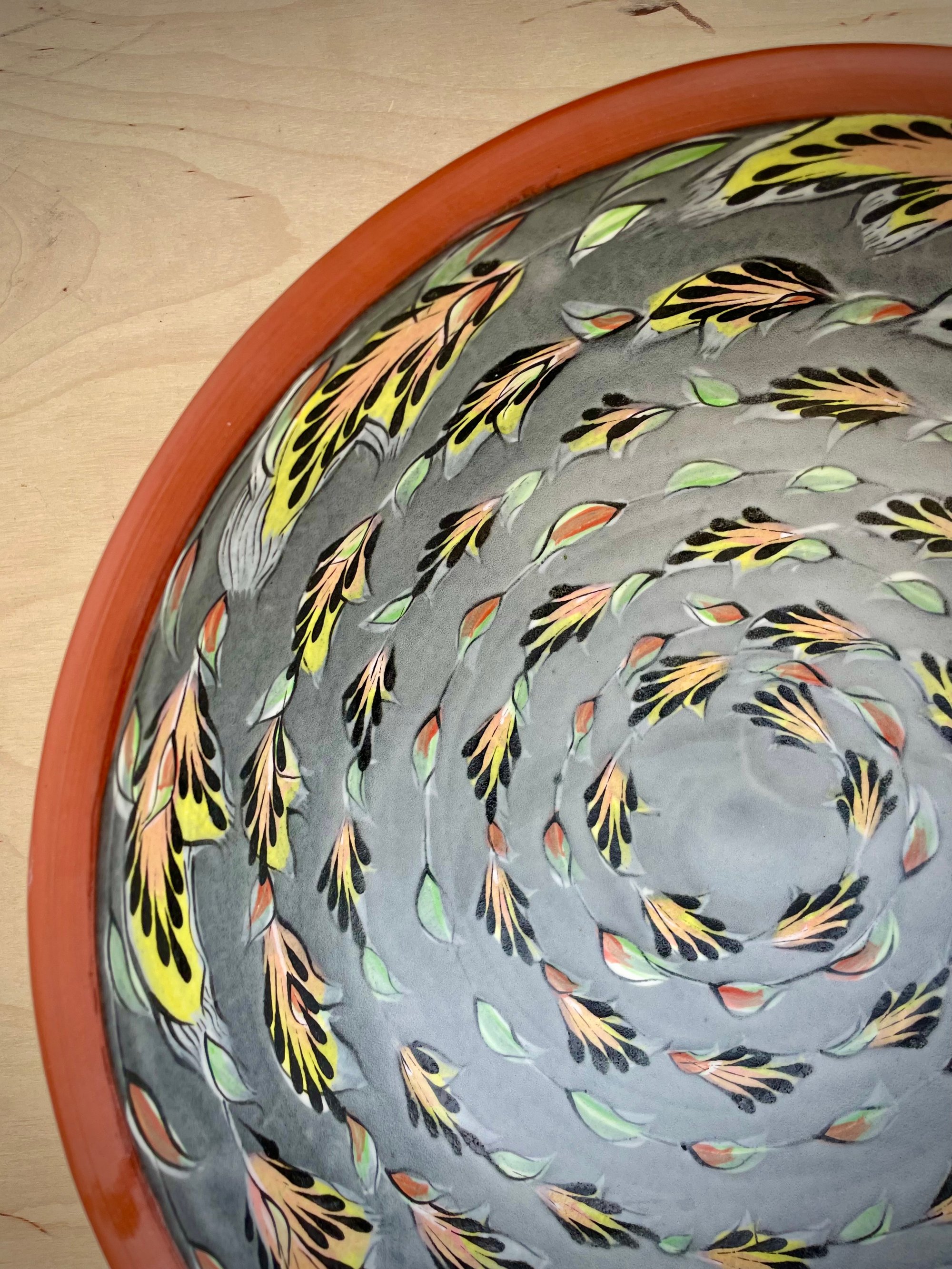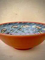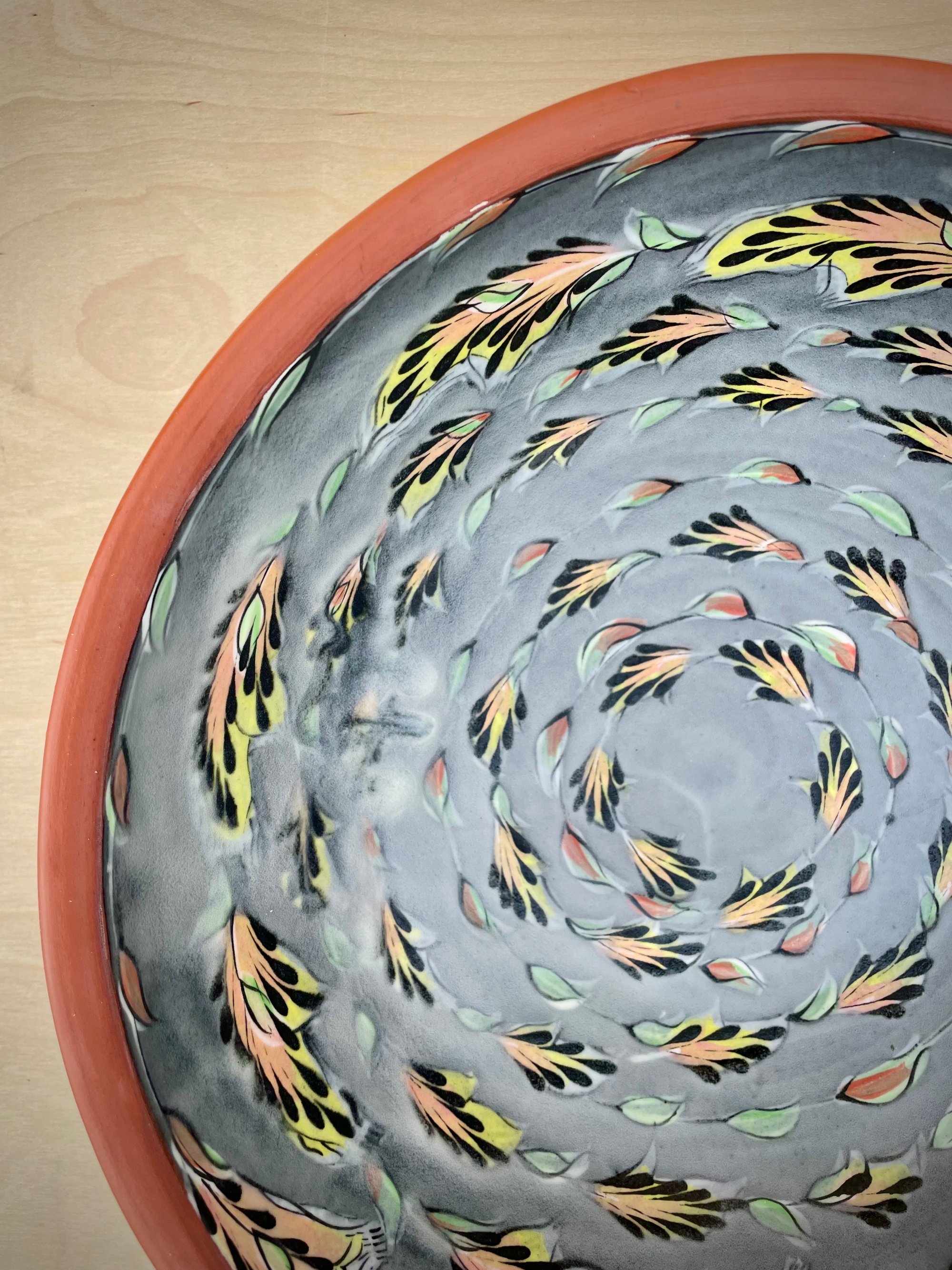 It's big. The outside is brick colored. It's a bowl. This is an oversized serving bowl/centerpiece. It is decorated with underglazes on the inside and glazed to be food, microwave, and dishwasher safe. The outside is terra sig and smooth.
