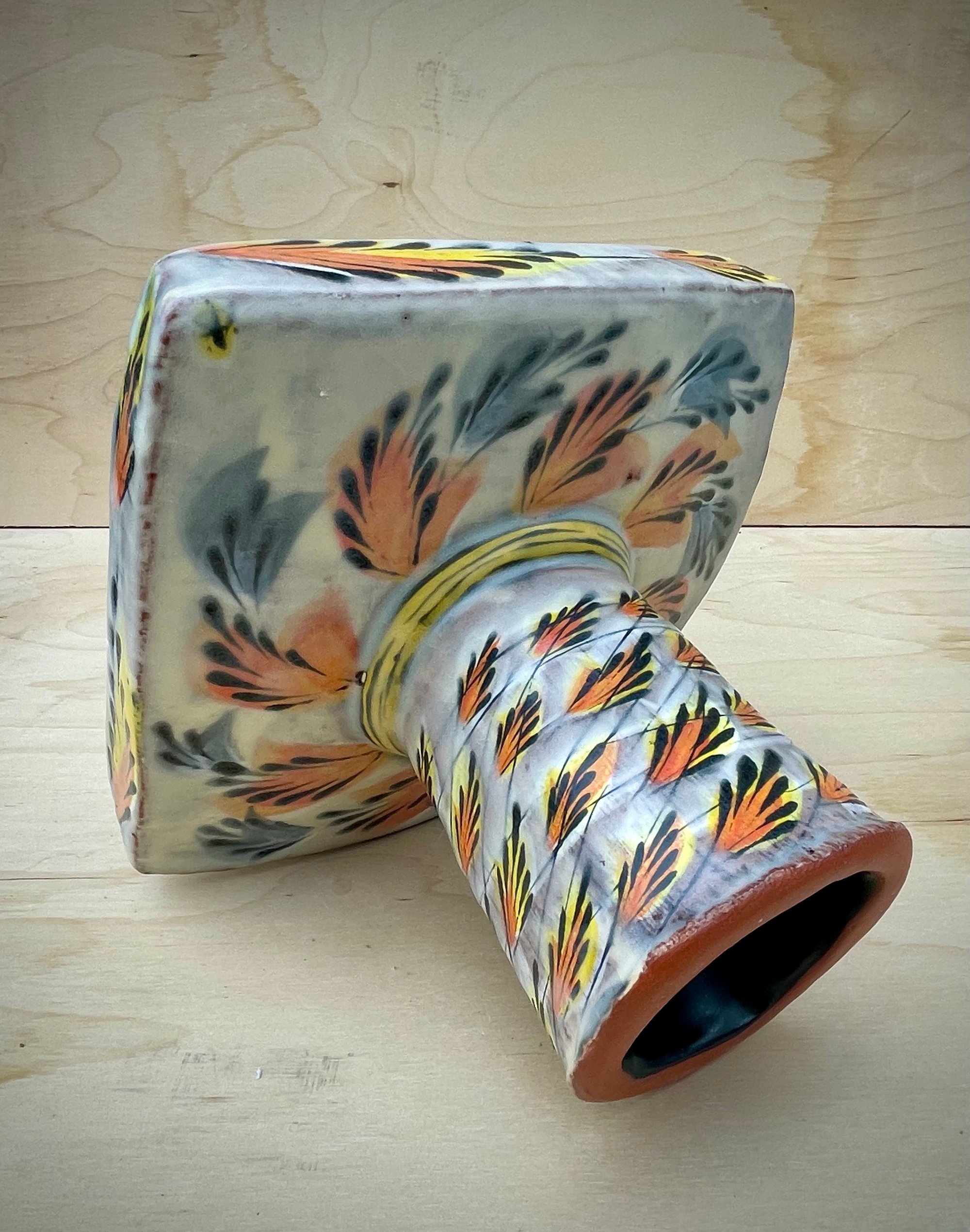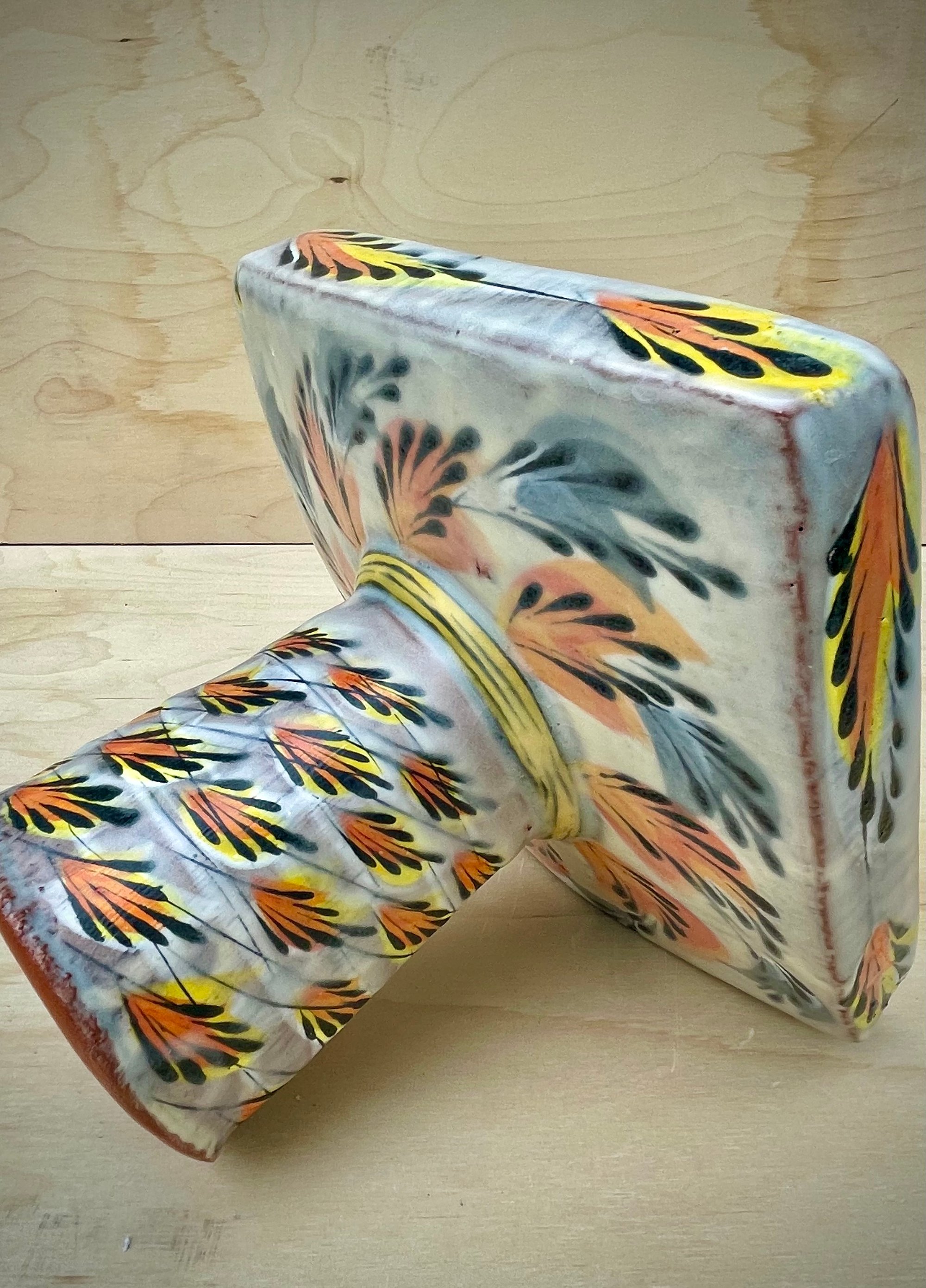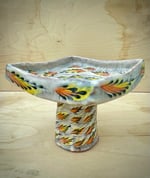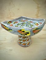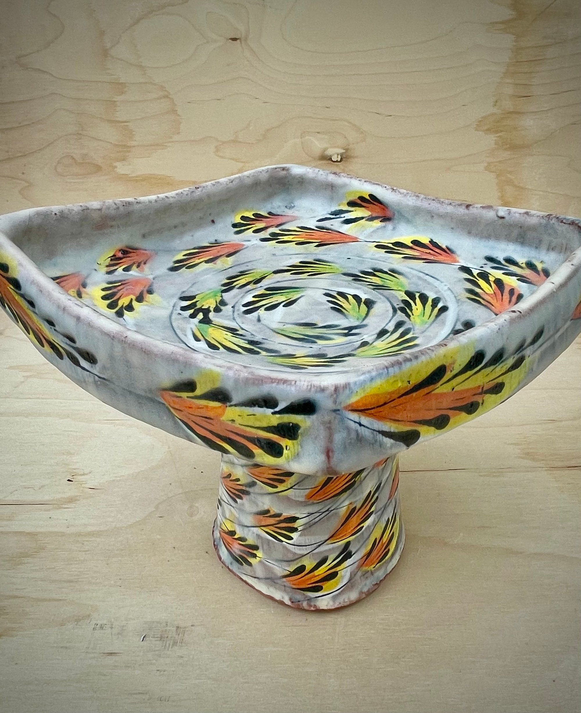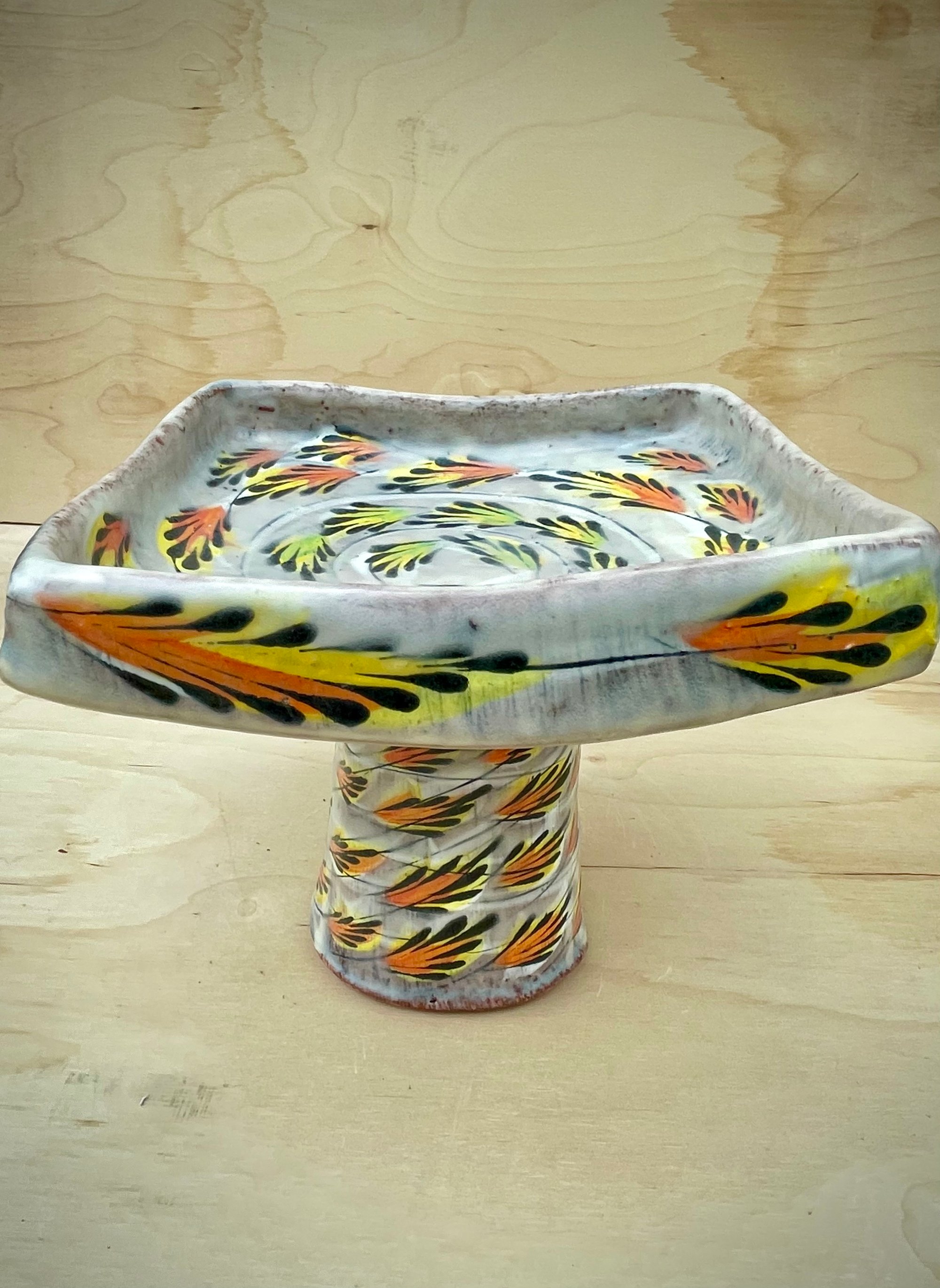 Elevate yourself with this elevated dish. It is designed to present. This piece combined wheel thrown and hand built elements, and creates just a little drama when in use.