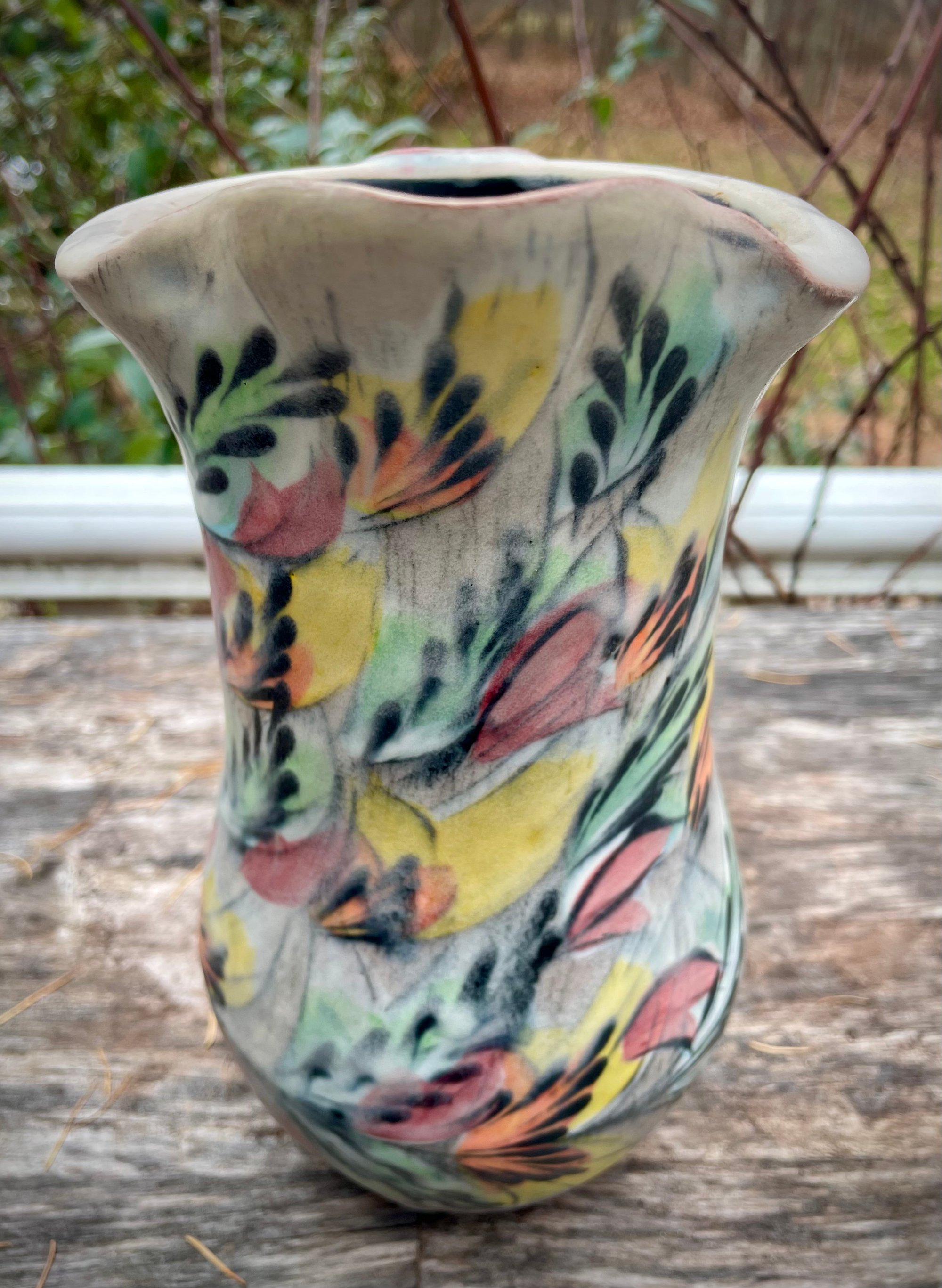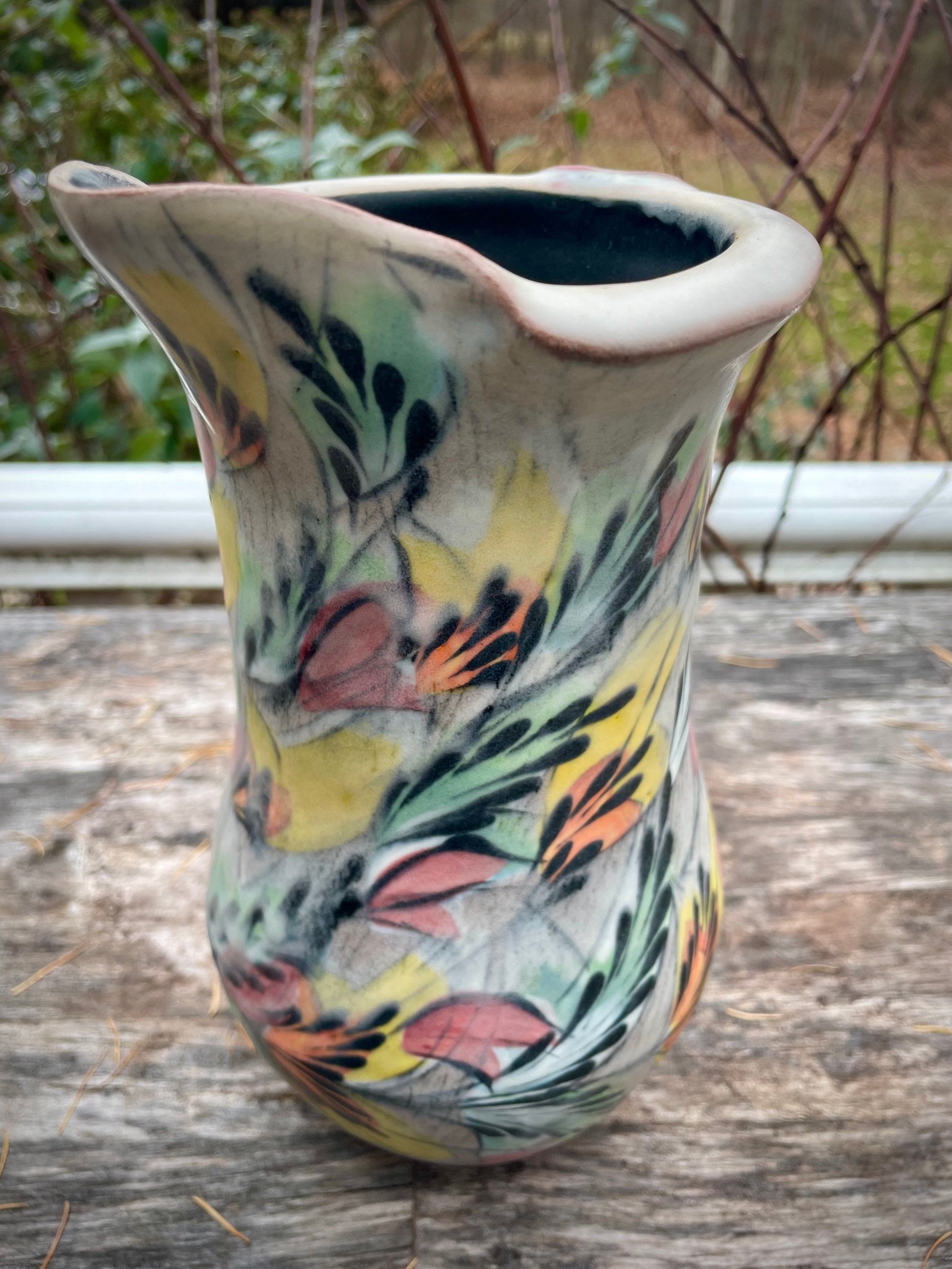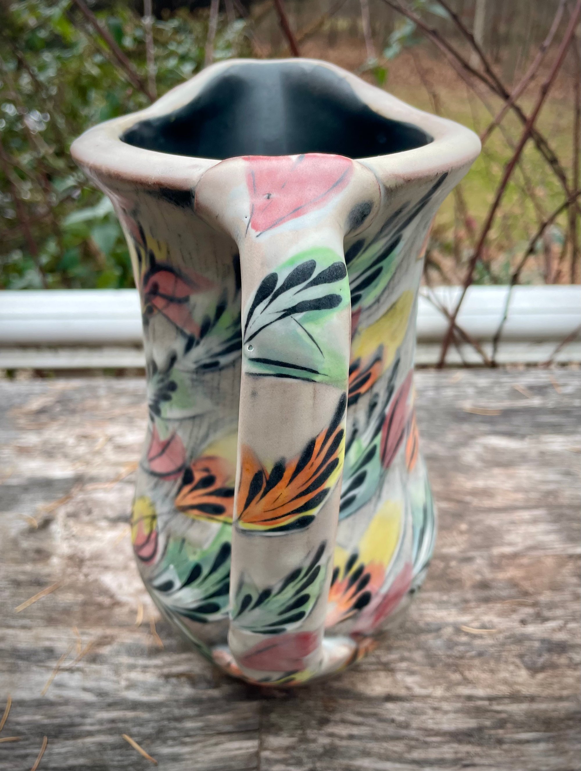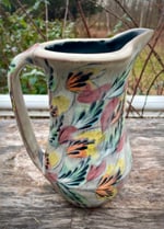 An explosion of flowers. This is a medium to large sized pitcher and I use these equally to display flowers and make pitchers of ranch water. Dimensions: