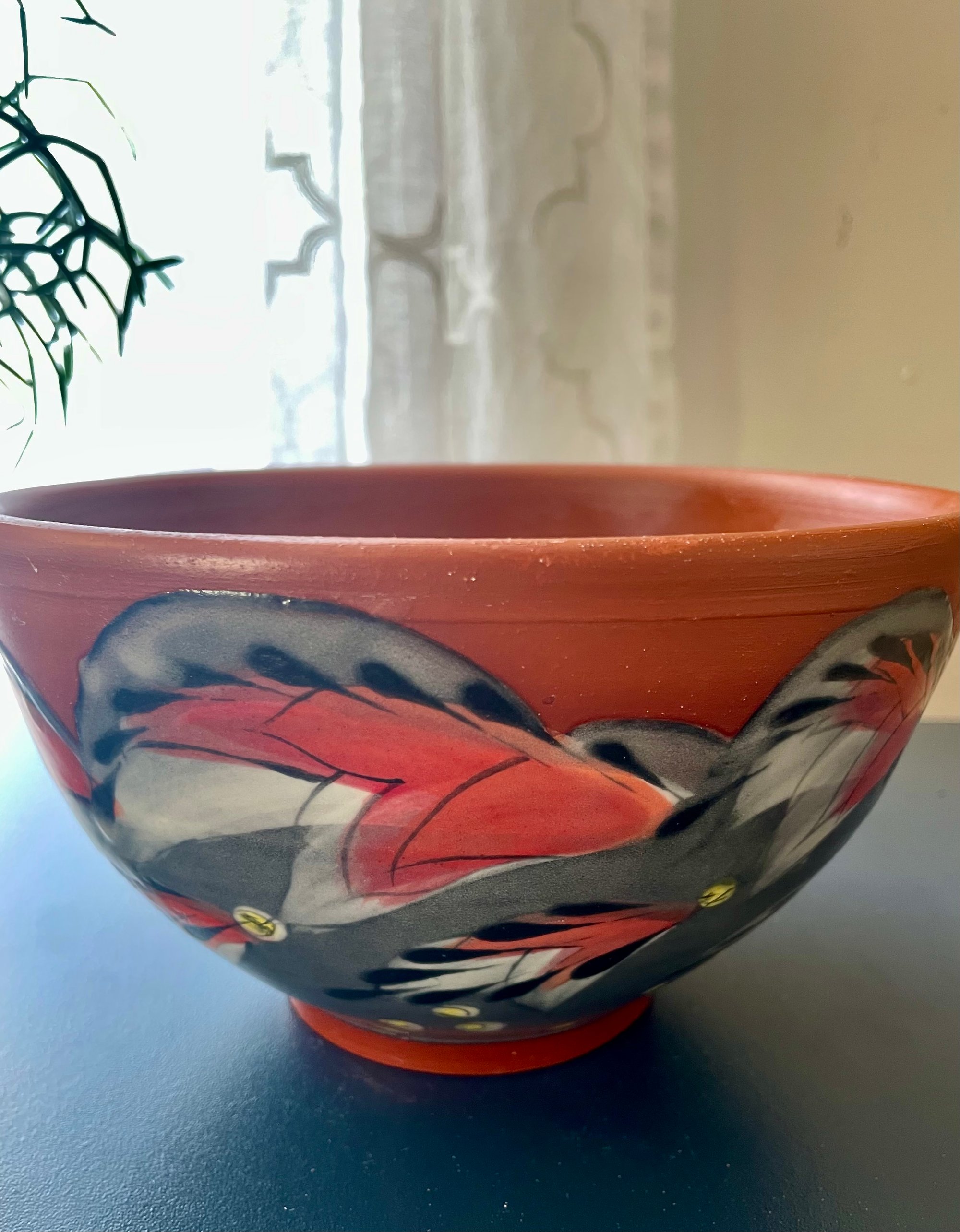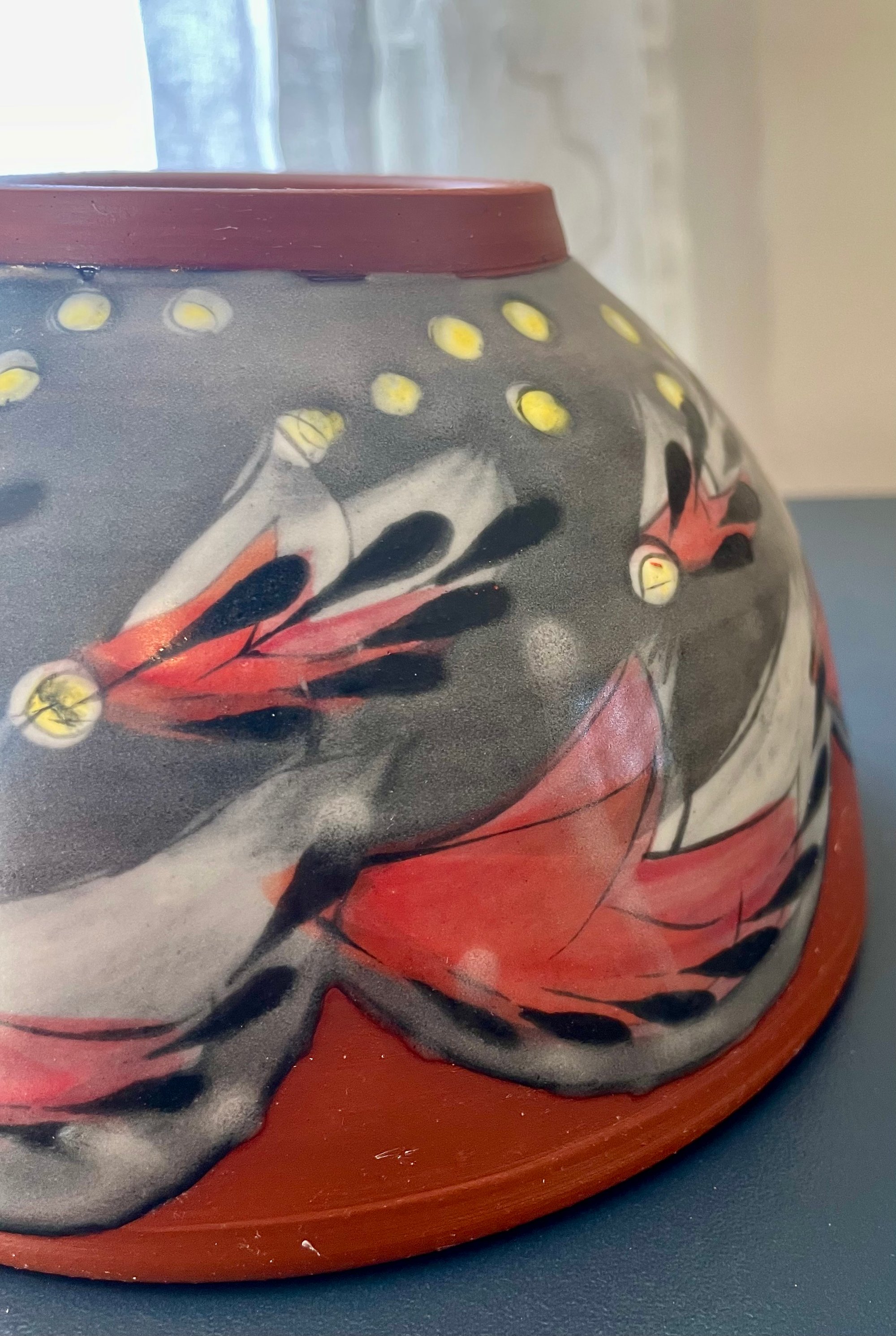 This classic shape is perfect for all soups but can be used for just about anything. Handmade and decorated, this piece is glazed to be food, microwave, and dishwasher safe. A combination of glaze, underglaze, slip, and terra sig are used to create this surface, and all brushwork is completed painstakingly by hand. Treat yourself.