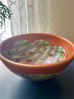 This classic shape is perfect for all soups but can be used for just about anything. Handmade and decorated, this piece is glazed to be food, microwave, and dishwasher safe. A combination of glaze, underglaze, slip, and terra sig are used to create this surface, and all brushwork is completed painstakingly by hand. Treat yourself.